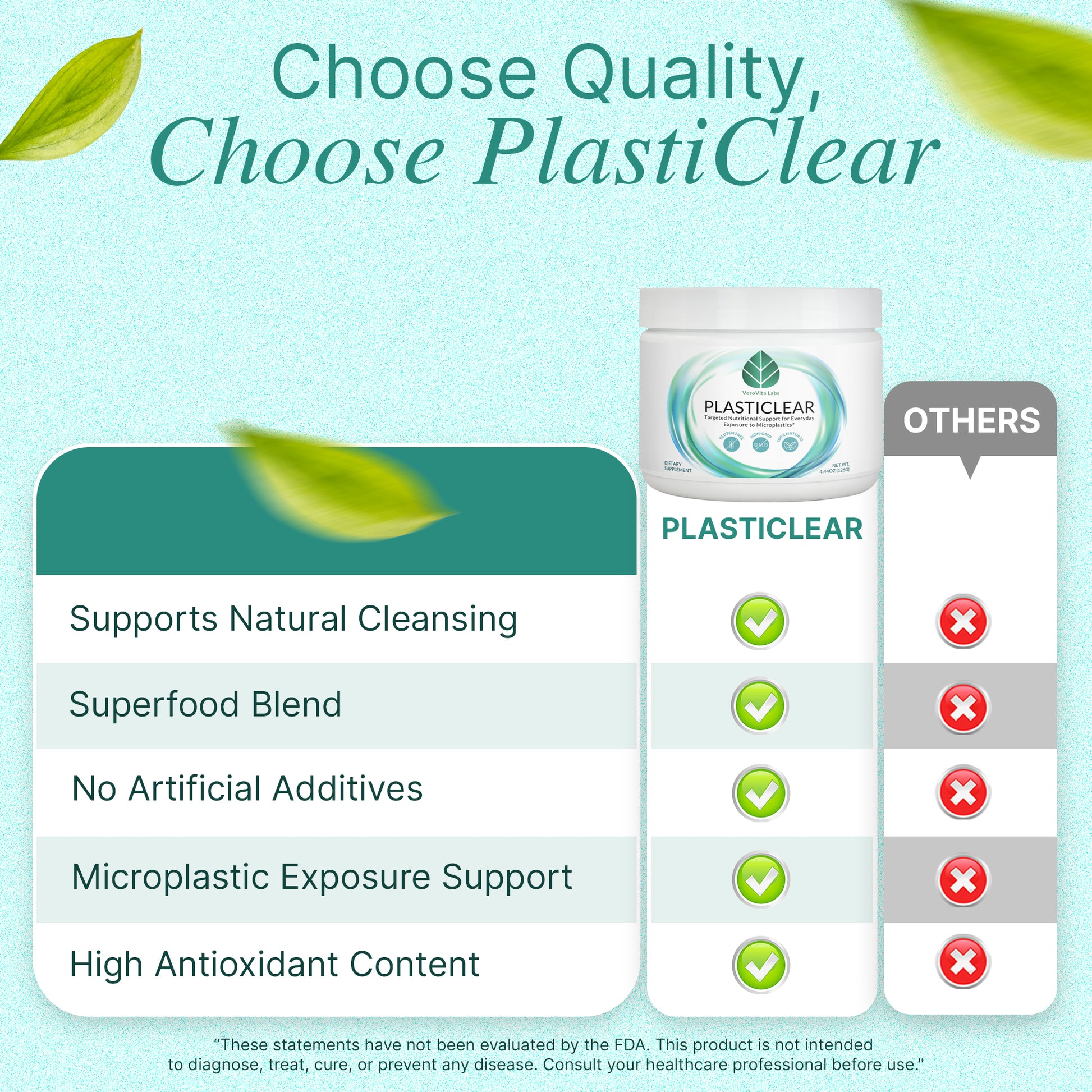 Every day, we’re exposed to microplastics through the air we breathe, the water we drink, and even the food we eat. PlastiClear™ is a premium supergreens formula designed to support your body’s natural cleansing processes with a blend of nutrient-rich plants, antioxidants, and herbal extracts.